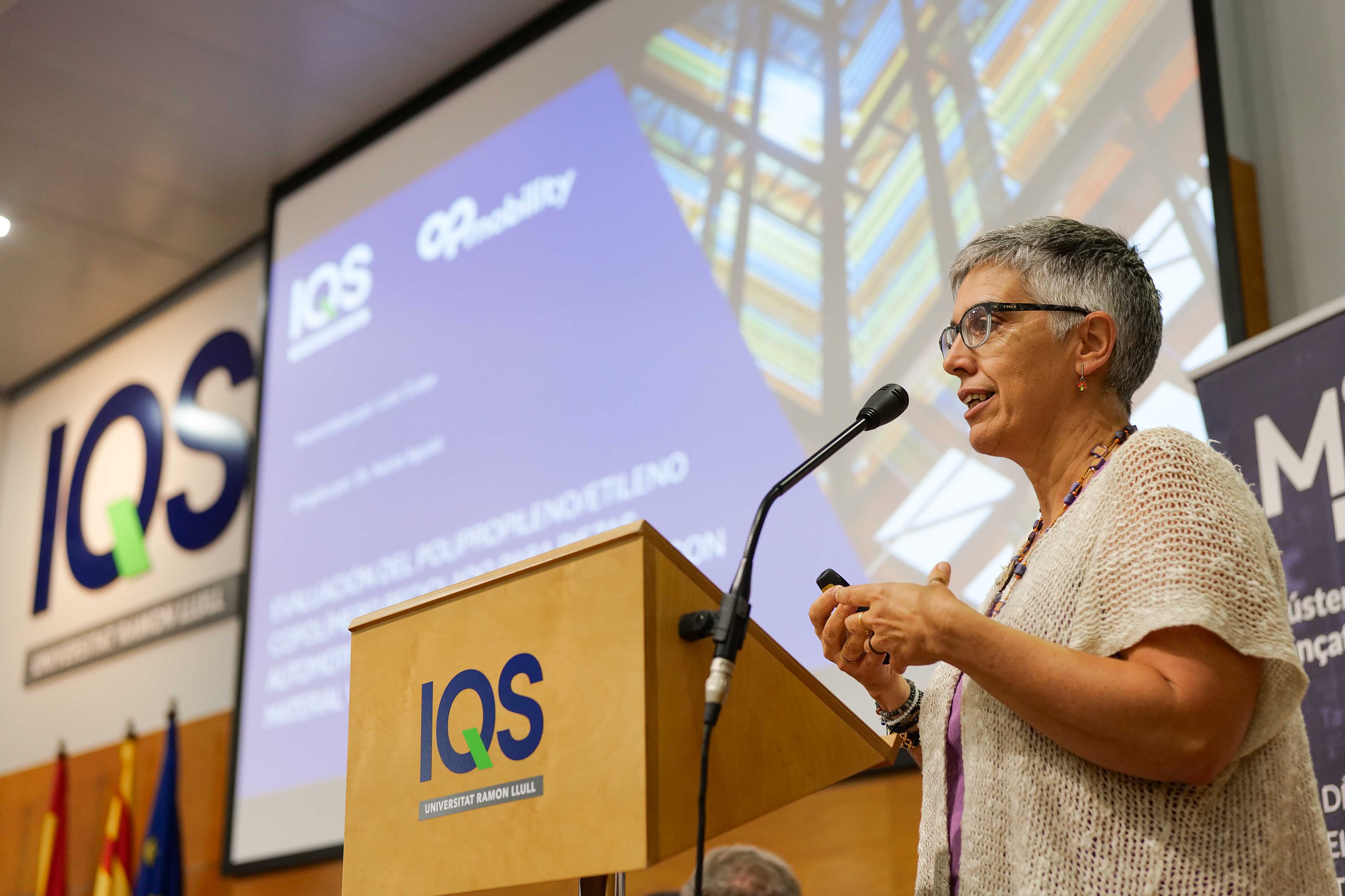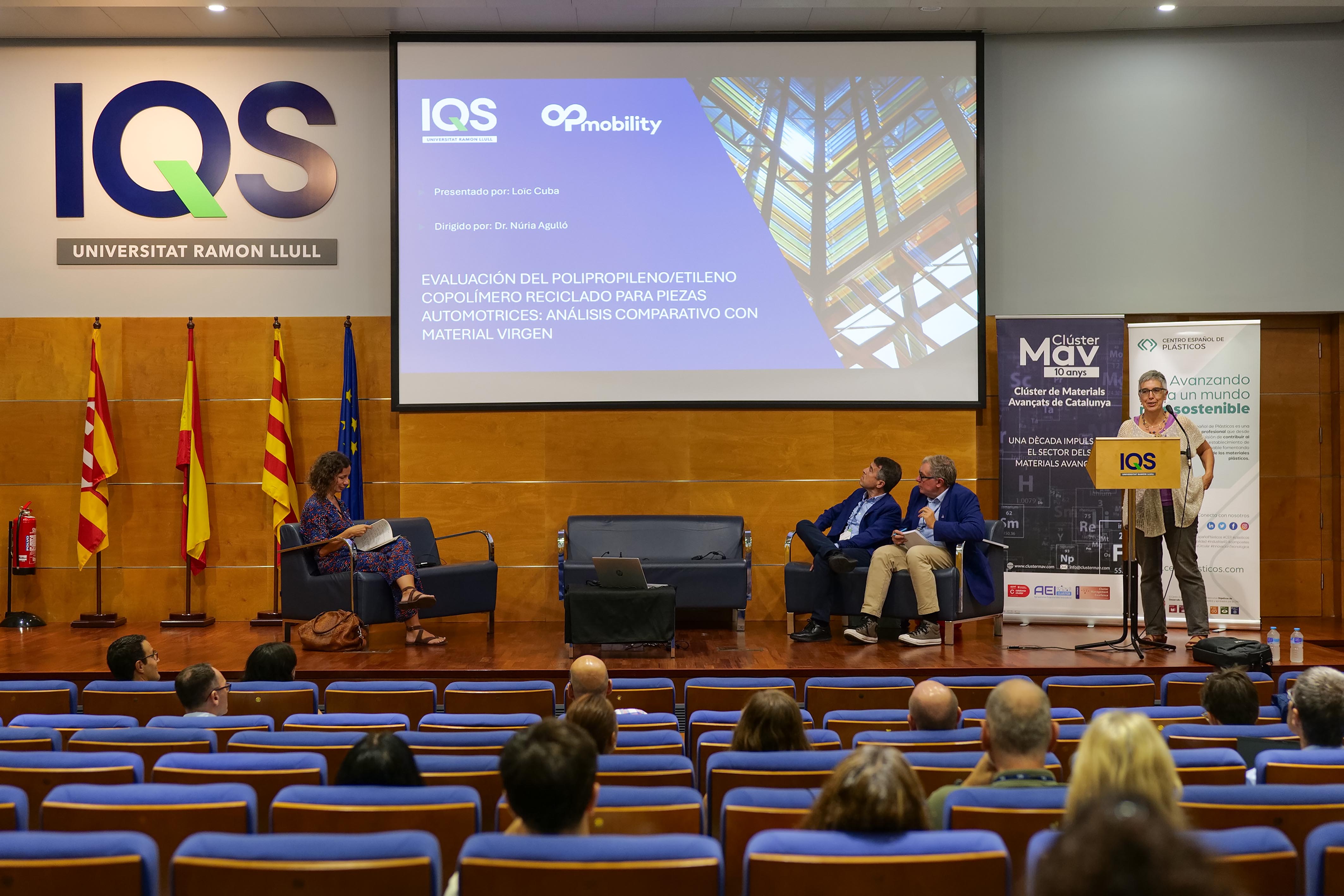 A continuació, la Dra. Núria Agulló, investigadora del Grup d’Enginyeria de Materials – GEMAT i responsable del Laboratori de Ciència de Materials d’IQS, va presentar els resultats satisfactoris que s’han obtingut en el treball de final de màster codirigit amb l’empresa OPMobility sobre l’avaluació de polipropilè/etilè copolímer reciclat per peces d’automoció.