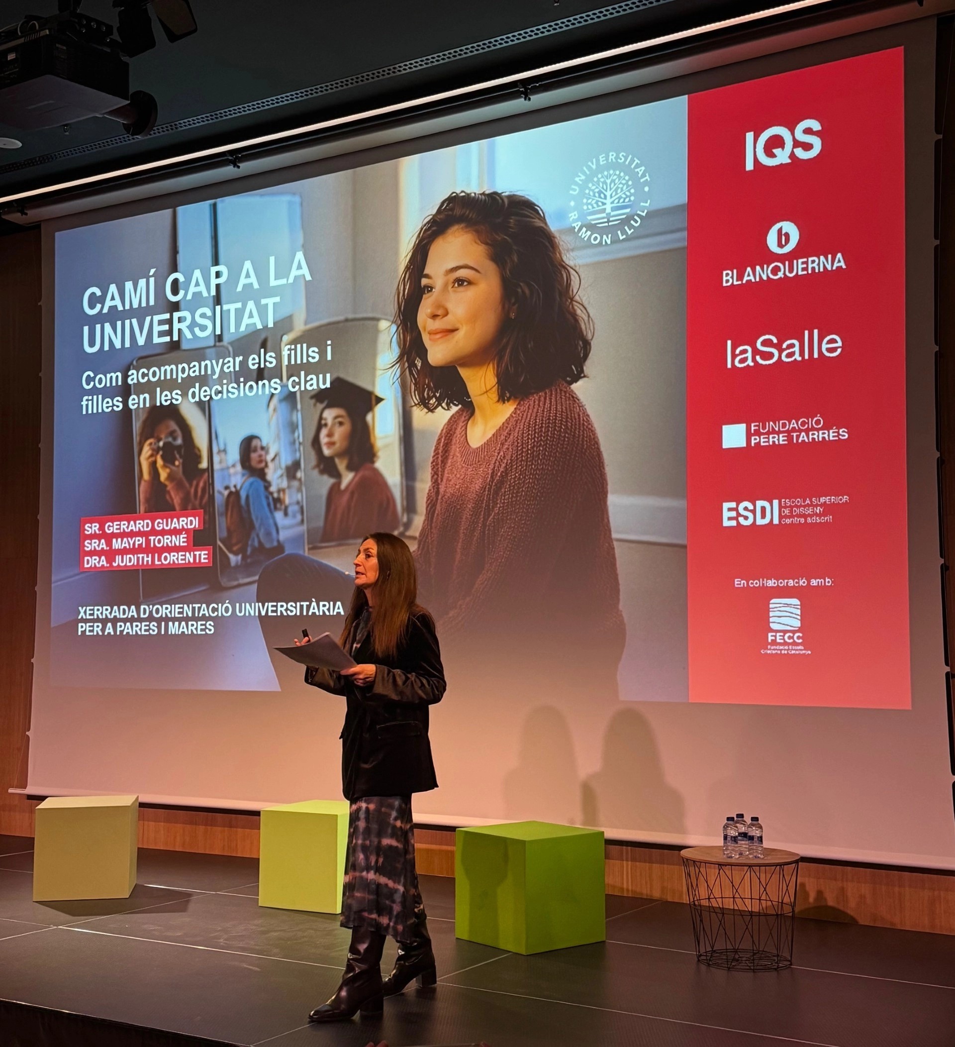 La Dra. Judith Lorente, psicòloga, professora de Blanquerna i membre del Servei d’Atenció Psicològica d’IQS, va destacar durant la seva intervención el paper dels pares i mares, fent una crida a la calma i a la comunicació oberta a casa, recordant que el camí universitari és una etapa de creixement on també és vital validar emocions dels joves.
