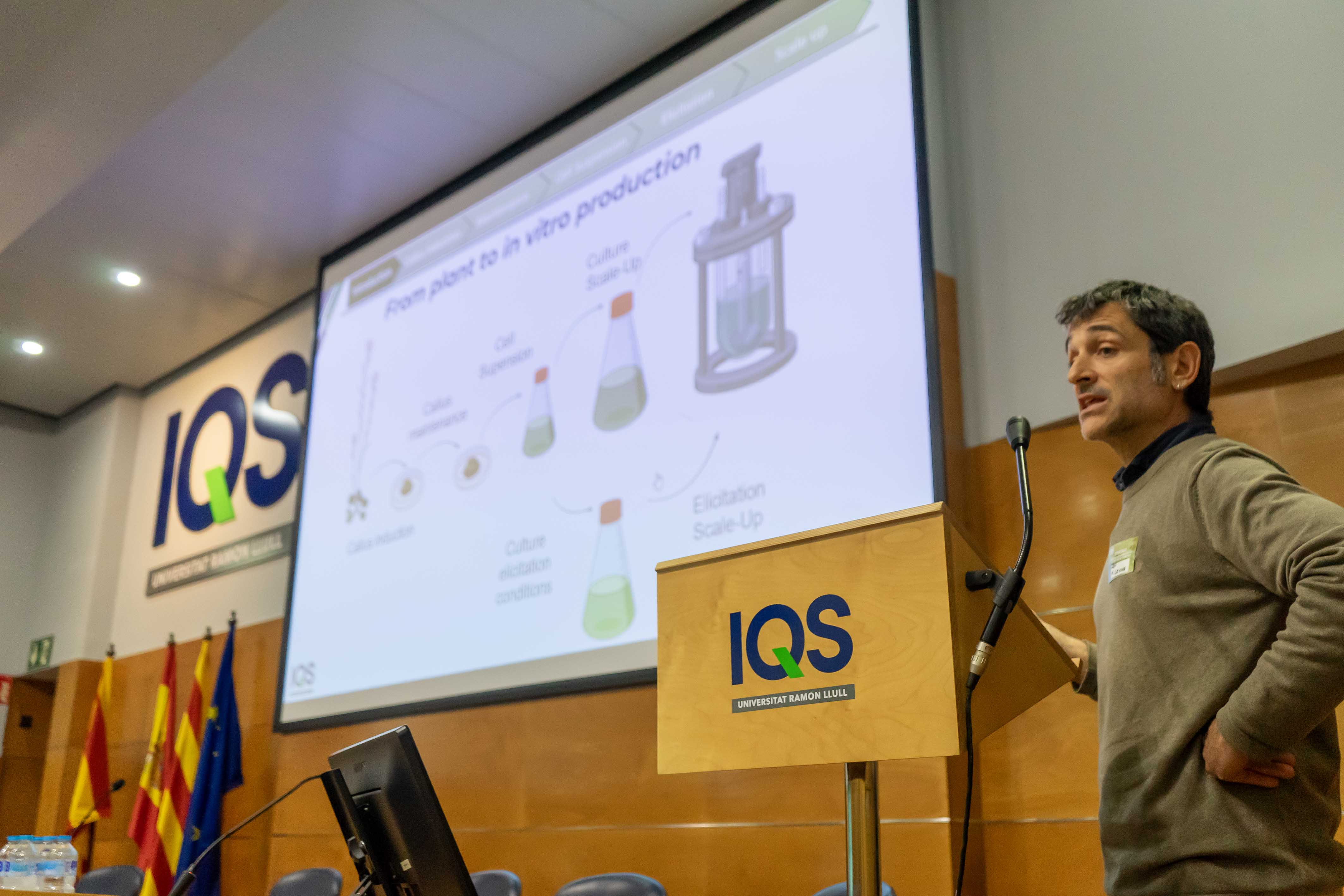 Después de una primera presentación a cargo de la Dra. Celia Campos de Muttulab sobre el marco regulador y los retos del uso de las células madre en cosmética, la primera parte de la jornada contó con ponencias a cargo del Dr. Martí Lecina Veciana, investigador del Departamento de Bioingeniería de IQS, quien habló sobre los retos y desafíos técnicos de la aplicación de las células madre vegetales, desde la generación e inducción del callo, hasta el proceso de escalado en biorreactores, basándose en la experiencia de su grupo de investigación; las aportaciones del Dr. David manzano Alias, de la empresa Provital, sobre la experiencia de su empresa en el uso de la biotecnología para conseguir un mayor control, eficacia, calidad y sostenibilidad en la producción cosmética, con cuatro casos de éxito de producción sostenible a partir de células madre vegetales; y la presentación de Miquel Vilafranca i Tello, estudiante de doctorado en Bioingeniería en IQS, que lleva a cabo un doctorado industrial con la empresa Biogründl sobre el establecimiento del callo y suspensión de albahaca, su mantenimiento, las metodologías utilizadas para establecer la suspensión, la elicitación de las células y el escalado final en biorreactor.