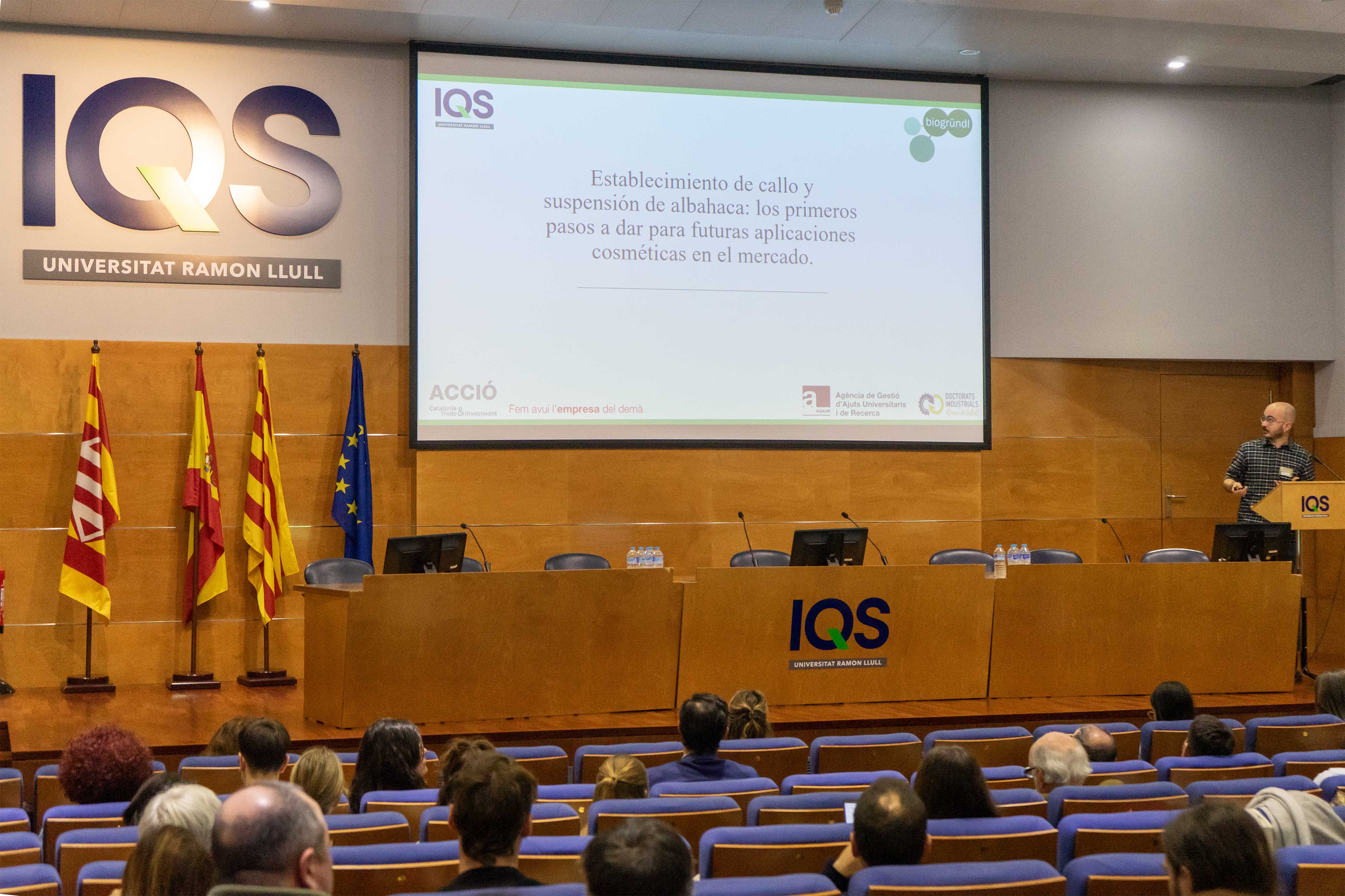 Después de una primera presentación a cargo de la Dra. Celia Campos de Muttulab sobre el marco regulador y los retos del uso de las células madre en cosmética, la primera parte de la jornada contó con ponencias a cargo del Dr. Martí Lecina Veciana, investigador del Departamento de Bioingeniería de IQS, quien habló sobre los retos y desafíos técnicos de la aplicación de las células madre vegetales, desde la generación e inducción del callo, hasta el proceso de escalado en biorreactores, basándose en la experiencia de su grupo de investigación; las aportaciones del Dr. David manzano Alias, de la empresa Provital, sobre la experiencia de su empresa en el uso de la biotecnología para conseguir un mayor control, eficacia, calidad y sostenibilidad en la producción cosmética, con cuatro casos de éxito de producción sostenible a partir de células madre vegetales; y la presentación de Miquel Vilafranca i Tello, estudiante de doctorado en Bioingeniería en IQS, que lleva a cabo un doctorado industrial con la empresa Biogründl sobre el establecimiento del callo y suspensión de albahaca, su mantenimiento, las metodologías utilizadas para establecer la suspensión, la elicitación de las células y el escalado final en biorreactor.