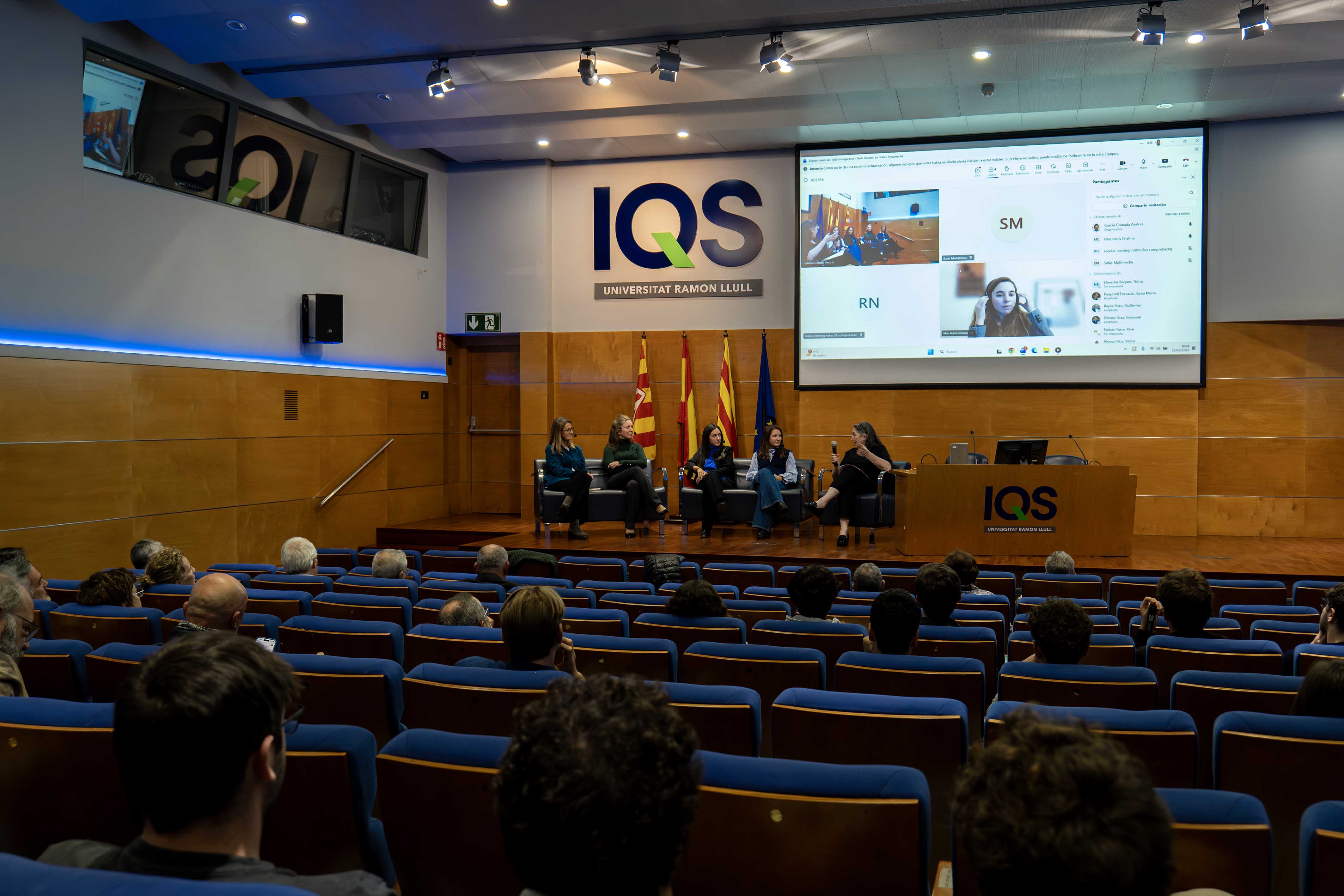 El eje central de la jornada fue la mesa redonda «La mujer en la ingeniería industrial», moderada por la Dra. Núria Llaverias, profesora del Departamento de Ingeniería Industrial de IQS School of Engineering. El debate contó con la participación presencial de Mariló Casas, presidenta de la comisión de Equidad, Tecnología y Futuro en EIC y Consultora Senior en SENER; Núria Esteban, gerente de Desarrollo de Conceptos en SEAT S.A.; Elena Qui, Past Senior Program Manager en Amazon, y Claudia Moslares, Senior Consultant en Deister Software. Además, para aportar una visión internacional, la mesa conectó online desde Hamburgo con Cristina Mas, Project Leader en Airbus.